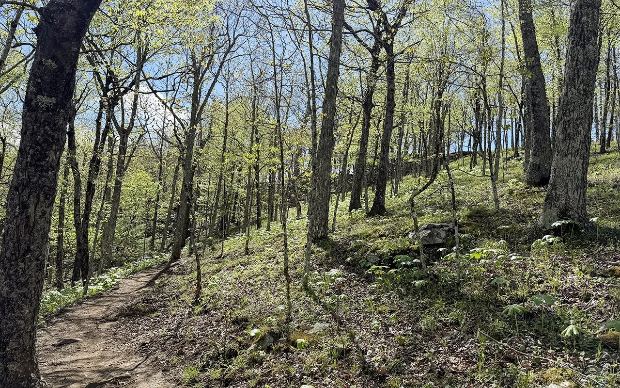This well-maintained trail ascends through a lush forest, lined with Catawba Rhododendrons and dogwoods. The elevation is moderate - about 574 ft. Nothing too strenuous, but just enough to get your heart pumping.